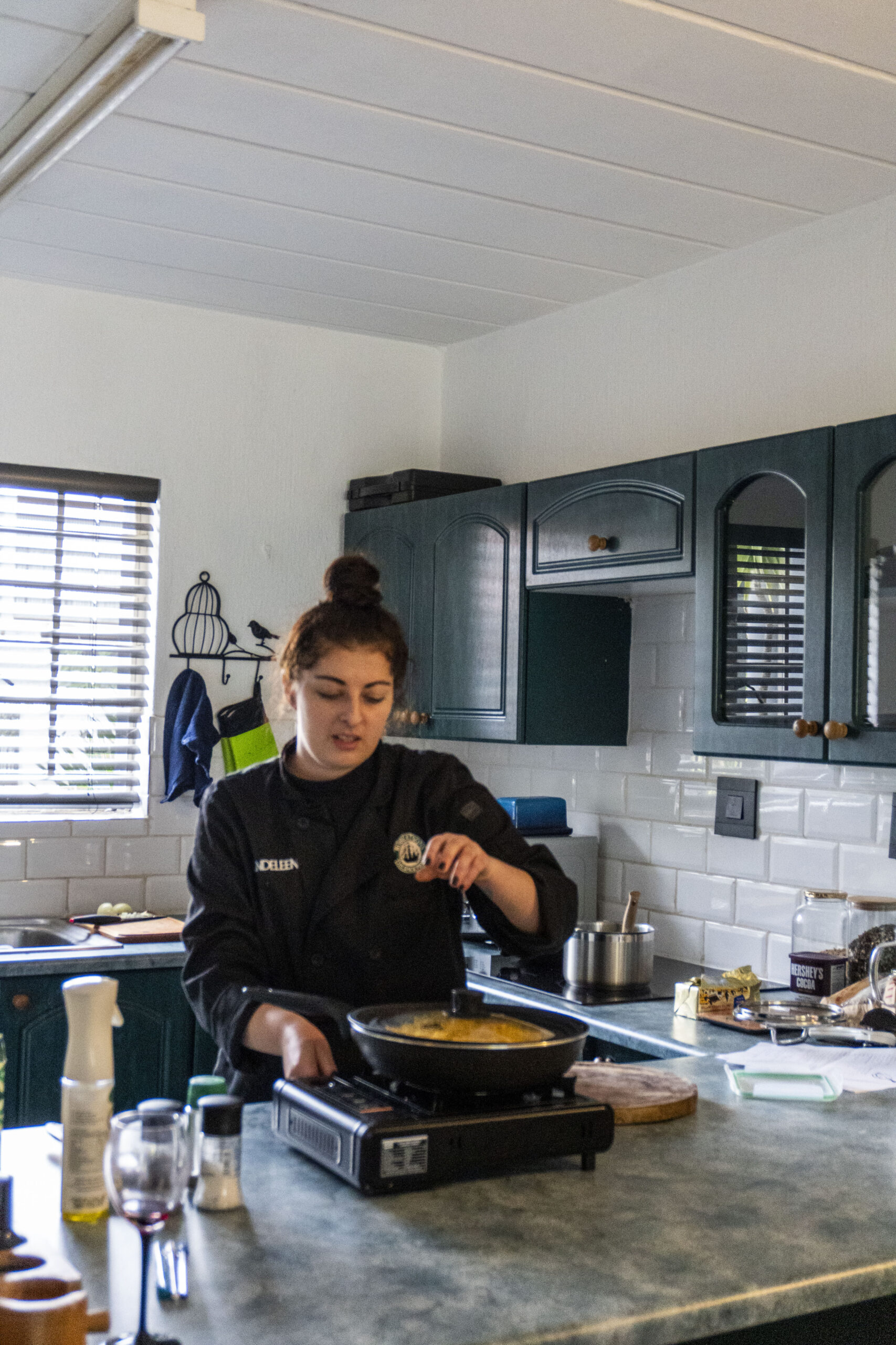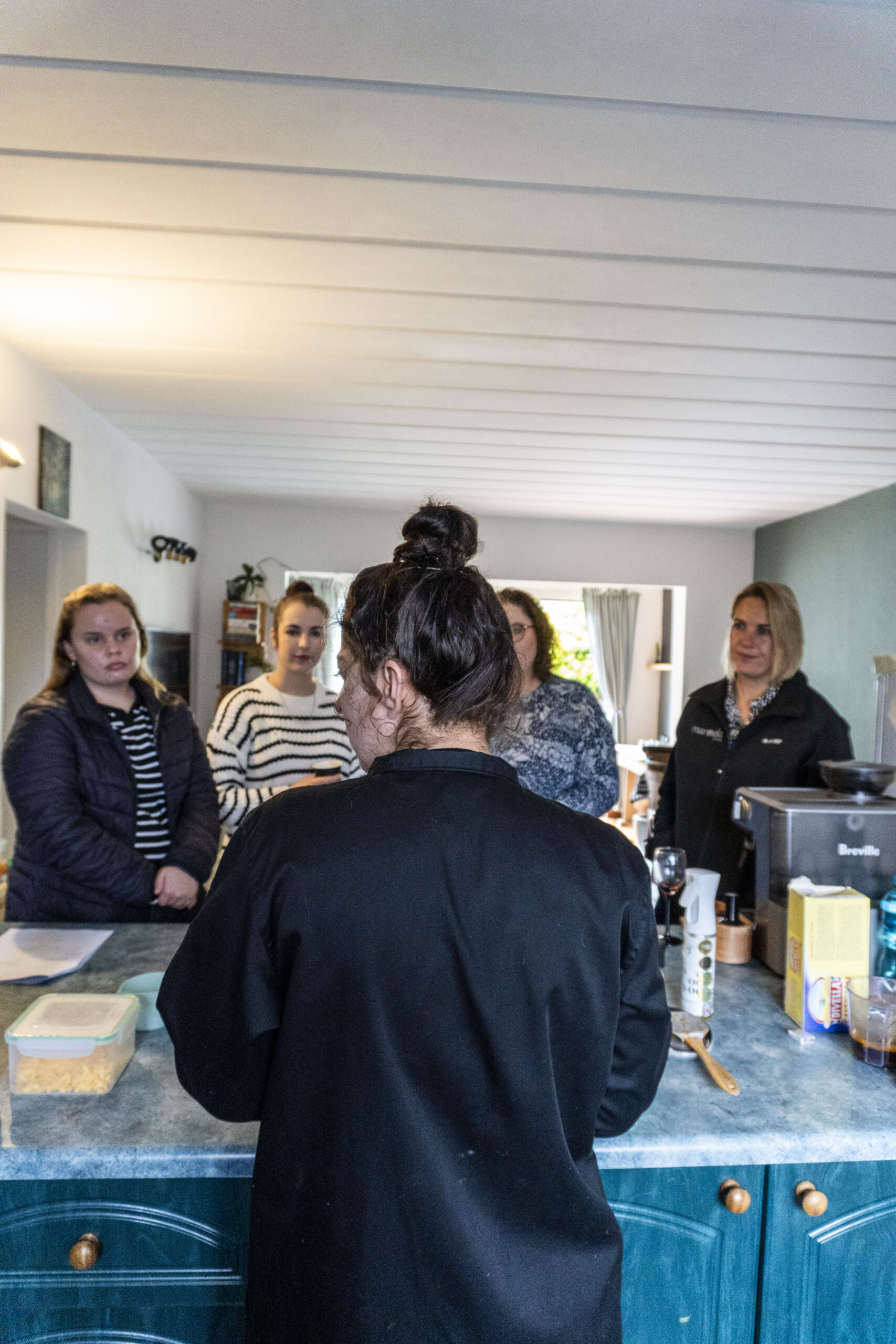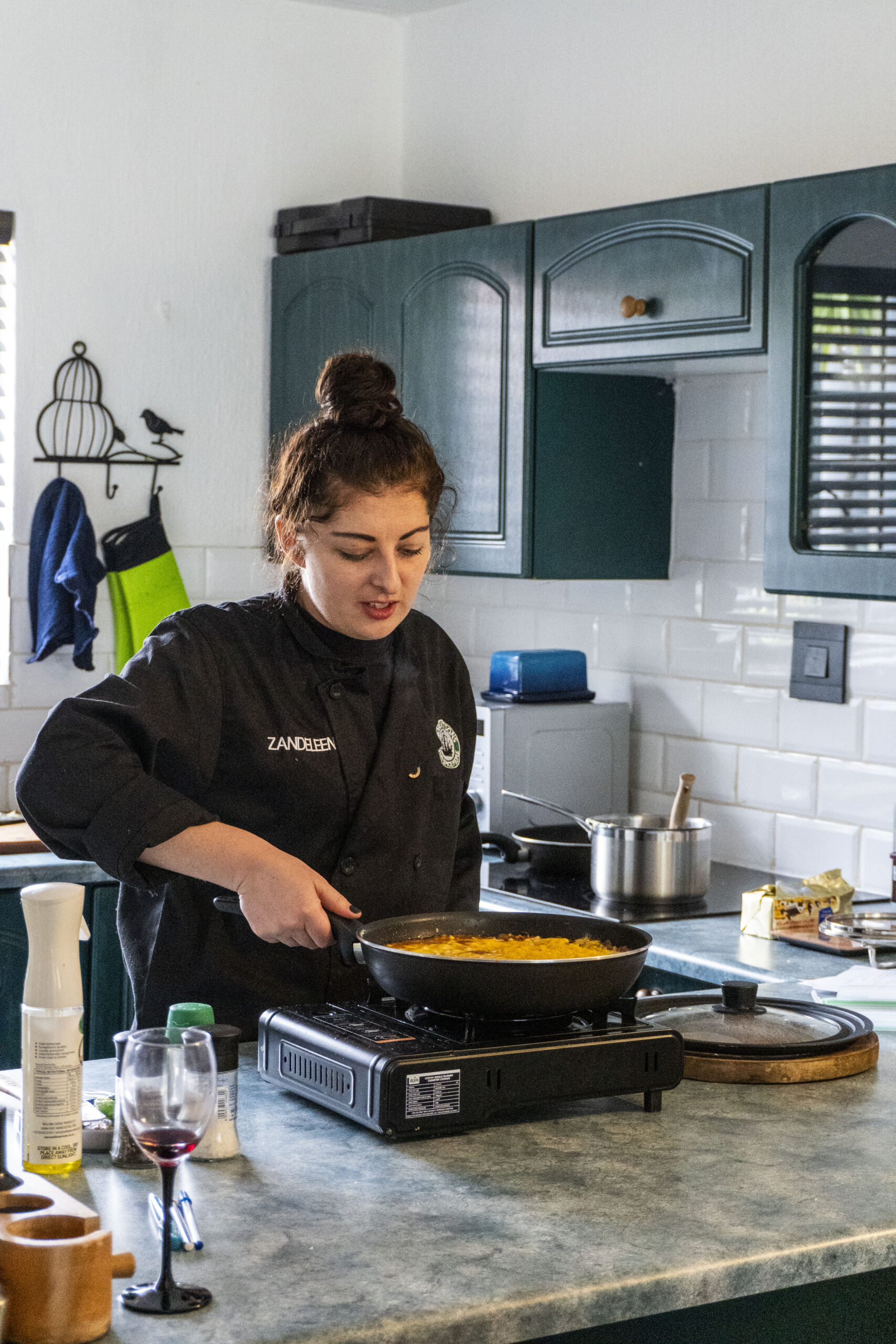 Ek het besluit om die klas by my huis aan te bied om kleiner groepies te akkommodeer. Dit het verseker dat almal gemaklik voel om vrae te vra, en het bygedra tot ‘n informele en gesellige atmosfeer. Nadat ons die geregte voorberei het, het ons almal saam ‘n heerlike maaltyd geniet, tesame met ‘n glasie wyn. Voor die klas het ons ‘n lekker koppie koffie geniet, met dank aan Jackelope Coffee Co., en gesels om die ys te breek en mekaar beter te leer ken.