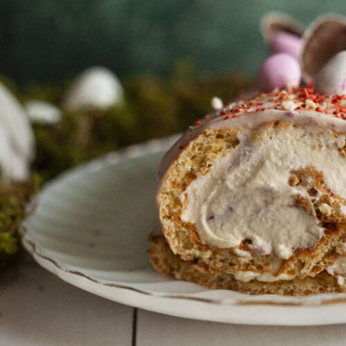 Light, fluffy vanilla sponge rolled with a dreamy berry cream filling, topped with a tangy berry cream cheese glaze, freeze-dried raspberries, and Easter egg decor. A showstopper perfect for spring or your Easter table!