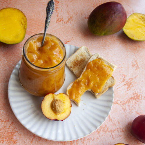 This vibrant and flavorful homemade jam combines the tropical sweetness of fresh mangoes with the juicy, tangy notes of peaches. The result is a luscious spread that perfectly balances sweetness and fruitiness, ideal for enhancing a variety of dishes.