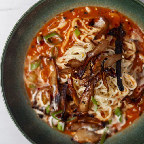 - Place noodles in bowls, pour over the broth, and top with crispy mushrooms, plant-based cream, chilli oil, sesame seeds, spring onion greens, and coriander.